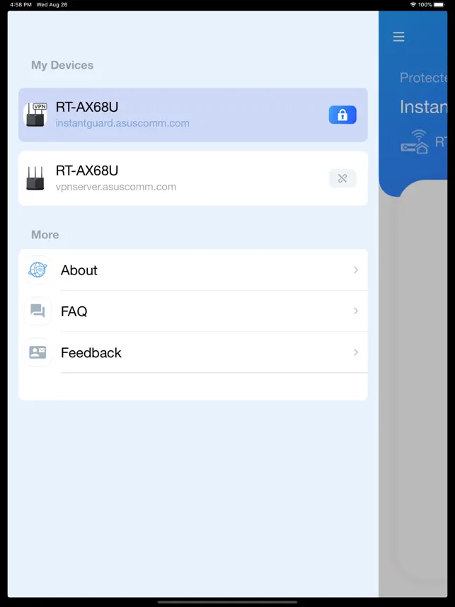 Instant Guard基於ASUS路由器的VPN功能,現在僅適用於管理員。 當您連接到公共Wi-Fi時使用Instant Guard應用程式,讓您就像在家裡使用安全網絡一樣 - 確保您的個人隱私保持安全並保護財務信息。 Instant Guard使您可以在出門在外時輕鬆訪問在家中的ASUS路由器,並在瀏覽器銀行,購物和聊天時通過虛擬專用網(VPN)連接來保持100%匿名。 將來,此功能將得到改進,以允許與您的朋友或家人共享VPN連接權限。關鍵特點 :1.一鍵式操作2.安全和加密的連線3.匿名上網4.更改您的IP地址和位置*CN地區販售的的華碩路由器不支援Instant Guard。Instant Guard應用程序支持以下華碩路由器:RT-BE96URT-AXE7800RT-AX92URT-AX89XRT-AX88U_ProRT-AX88URT-AX86U_PRORT-AX86URT-AX86SRT-AX82U_V2RT-AX82URT-AX68URT-AX59URT-AX58U_V2RT-AX58URT-AX57_GoRT-AX57RT-AX56URT-AX55RT-AX5400RT-AX54RT-AX53URT-AX52RT-AC88URT-AC86URT-AC3100RT-AC5300GS-AX3000GS-AX5400GT6GT-AC2900GT-AC5300GT-AX11000GT-AX11000_PROGT-AX6000GT-AXE11000GT-AXE16000TUF-AX3000TUF-AX3000_V2TUF-AX4200TUF-AX5400TUF-AX6000ZenWiFi CT8ZenWiFi XD4ZenWiFi XD5ZenWiFi XD6ZenWiFi XP4ZenWiFi XT9ZenWiFi AX (XT8)ZenWiFi AX Hybrid (XC5)ZenWiFi ET8ZenWiFi Pro ET12ZenWiFi Pro XT12