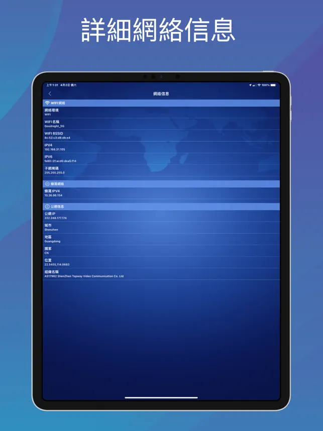 測速寶(Speed Baby)是一款專門為手機用戶提供各種網絡測速,寬帶測速,專業、精準的測速工具。選擇我們的優勢:【一鍵測速】只需數秒,快速、準確獲得網速測試結果;【全網測試】支持各大運營商測速;支持Wi-Fi測速、蜂窩數據、2G/3G/4G/5G的網絡檢測;【詳細數據】詳細展示測速結果:延遲、上傳、下載、IP地址、運營商等詳細網絡信息,讓您隨時隨地查看當前網絡情況;【全能工具】Ping測試、視頻、遊戲、社交、網絡延遲測試、路由追踪、根據域名查找IP、蹭網檢測等;【網絡診斷】突然斷網、連網卻無法訪問網頁,一鍵診斷各種網絡問題;【測試歷史】支持查看您的測速詳細信息;【小部件擴展】顯示實時網絡速度和磁盤信息,輕輕一拉即可體驗。關於自動續期訂閱的說明:訂閱的時長和價格:-1個月:¥10元-12個月:¥60元-新用戶優惠:首月¥1元,然後每年¥60元-永久使用:¥158額外的說明:- 在 iTunes和Apple Store Apple ID設置,任何時候都可以取消訂閱。所有價格適用的當地銷售稅。- 將在確認購買時向iTunes帳戶付款。- 訂閱自動續訂,除非在當前自動續訂期限結束前至少24小時關閉。- 賬戶將在本期結束前的24小時內收取續費,並確定續約費用。- 訂閱可能由用戶管理,並且可以在購買後通過轉到用戶的賬戶設置關閉自動續訂。- 在有效訂閱期間不允許取消當前訂閱。隱私協議: https://pages.flycricket.io/speed-baby/privacy.html服務條款: https://pages.flycricket.io/speed-baby/terms.html