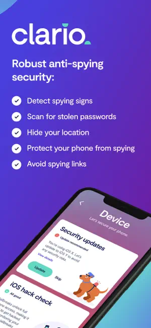 Clario’s mobile app ensures your security and privacy. It’s a simple yet powerful mobile security app, with integrated expert human assistance on-hand 24/7.Key Features of Clario: Security & Privacy▶ Fraud link checker▶ Identity protection with data breach monitor▶ Fast VPN (virtual private network)▶ Ad blocking▶ Strong Wi-Fi Security▶ 24/7 live expert assistanceToday your mobile phone is your window to the world. You use it for shopping, banking, staying in touch, and much more. Your mobile phone stores the keys to your social accounts, your private info, and precious memories. The best way to stop strangers peering back in is the Clario mobile security app.WHY SHOULD YOU CHOOSE CLARIO?Unlike other apps that provide temporary security fixes, Clario brings you peace of mind every time you go online. Our pioneering tech works in synergy with digital security experts experts helps you live your digital life safely 24/7.• Multiplatform: all-in-one bundle for Mac, mobile & web• Award-winning: #3 Product of the Day on ProductHunt• Powerful: first mobile security app with built-in 24/7 support• Trusted: 4.8 rating on Trustpilot• Private: Connect securely with a VPN• Caring: Monitor for leaked passwords, SSN, phone numbers, or credit card numbers• Reliable: Get help from 24/7 security experts Behind Clario’s uniquely intuitive design, lies a powerful toolset that covers your digital security and privacy needs - all in one app.HOW CAN CLARIO PROTECT YOU?Clario’s powerful security solution is backed up by advanced encryption and IKEv2/IPsec VPN protocols.KEY FEATURES:▶ WEB PROTECTIONLearn which sites are safe before you open them. See fraudulent, malicious, or spam links in your search results. Automatically block unprotected sites. Safari extension available for iOS 15 users▶ IDENTITY PROTECTIONMonitor your email addresses for data breaches 24/7. We'll instantly alert you for leaks of your passwords, credit card number, phone number, or SSN. Re-secure your accounts to avoid ID theft. ▶ NETWORK SECURITYUse Clario’s VPN to encrypt your data and stay safe while using a home network or public Wi-Fi. Anonymize your online activity on any network.▶ BROWSING SAFETYBrowse securely and privately without your internet provider tracking you. Access your favorite content from around the world.▶ AD BLOCKINGGet rid of annoying ads and enjoy a cleaner, quicker, more comfortable time online.▶ HUMAN HELPNo chatbots. No trawling FAQs and “Community Forums”. 600 real humans here to help solve real problems any time you need us, 24/7.Life’s stressful enough without having to worry about digital security too. Clario gives you effortless, personalized control of your digital life from one beautifully designed and easy-to-use app.Clario subscription includes:• 7-day free trial: Completely free of charge! No commitment, cancel anytime.• Types of subscription: Annual; Monthly.Support: hello@weareclario.comFacebook: https://www.facebook.com/weareclario/Instagram: https://www.instagram.com/clario.antispy/Twitter: https://twitter.com/weareclarioClario Community: https://www.facebook.com/groups/clario.communityTERMS:• Payment will be charged to your iTunes Account at confirmation of purchase.• Account will be charged for renewal within 24-hours prior to the end of the current period, and identify the cost of the renewal.• Subscriptions will be charged to your credit card through your iTunes account. Your subscription will automatically renew unless canceled at least 24 hours before the end of the trial period.• You can manage your subscription at any time, either by viewing your account in iTunes or from Account Settings on your device after purchase. Auto-renewal may be turned off by going to the user's Account Settings after purchase.