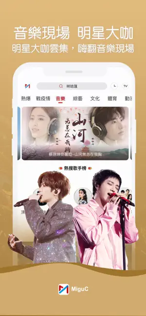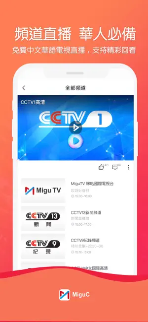 【MiguC陪你一起宅】【音樂現場】周杰倫帶你享受極致音樂百變女王蔡依林絕美開場華語天后林憶蓮歌曲串燒嗨翻全場梁靜茹直擊你心里最柔軟的地方蔡徐坤唱歌互動兩不誤薛之謙演繹現代愛情裡的玄幻色彩華晨宇靈魂吶喊韻味十足【電視頻道】24小時無間斷追擊多路頻道,隨時隨地掌握最新資訊!《CCTV1綜合高清》《CCTV13新聞》《CCTV4中文國際高清》《CCTV9紀錄》《CCTV2財經》《CCTV14少兒》《CCTV10科教》《CCTV12社會與法》《CCTV11戲曲》《CCTV7軍事農業》《CCTV法語》《CCTV西班牙語》《CCTV阿拉伯語》《CCTV俄語》【自製綜藝】熱門綜藝任你追!《哎呀好身材》《國潮研究所》《MG娛樂君》《進擊的咪咕熊貓驚》《大美之春》《直播聯合國》《碑後有故事》《見字如面》《我們一起上春晚》【經典卡通】經典卡通帶你回到童年!《葫蘆兄弟》《哪吒鬧海》《黑貓警長》《阿凡提》《孫悟空》《三毛》《舒克和貝塔》《三個和尚》《邋遢大王》【客戶端專屬福利】獨家正版影音內容1080P高清畫質無廣告順暢播放【立即下載MiguC,更多精彩內容等你發現!】